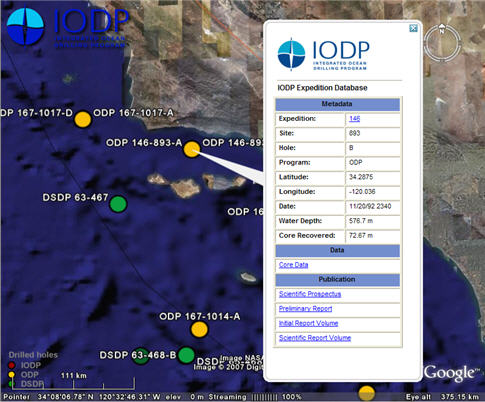 It seems each week, another online database provides a way to find their information spatially via GoogleEarth. Earlier today, I posted about a new ocean drilling vessel for the IODP (Integrated Ocean Drilling Program). I found myself surfing around their website and found that IODP now offers a GoogleEarth link for a comprehensive map of all boreholes.