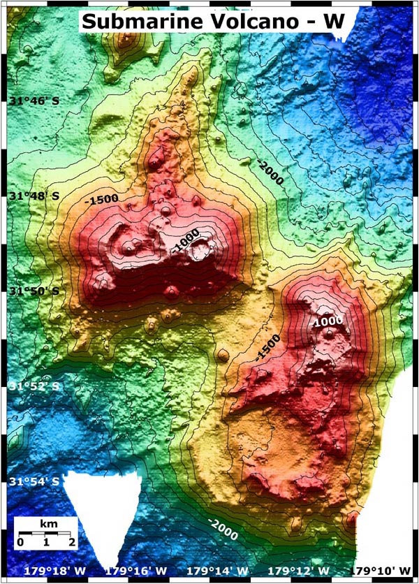 The images below are of two submarine volcanoes along the Kermadec Arc, northeast of New Zealand. Click on them for a bigger version.