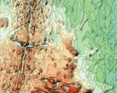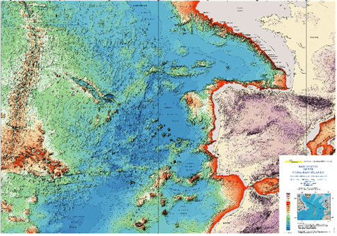 The map below is a snapshot of the entire map area. As noted above, scroll to the bottom of this site to download the 9 MB jpeg. I especially like their use of oranges and reds for the shallowest depths in the bathymetry scale.