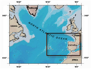 The map at left is for context and shows the area of interest. We will be looking at the area from offshore of France, the Iberian Peninsula, and parts of northernmost Africa to the Mid-Atlantic Ridge.