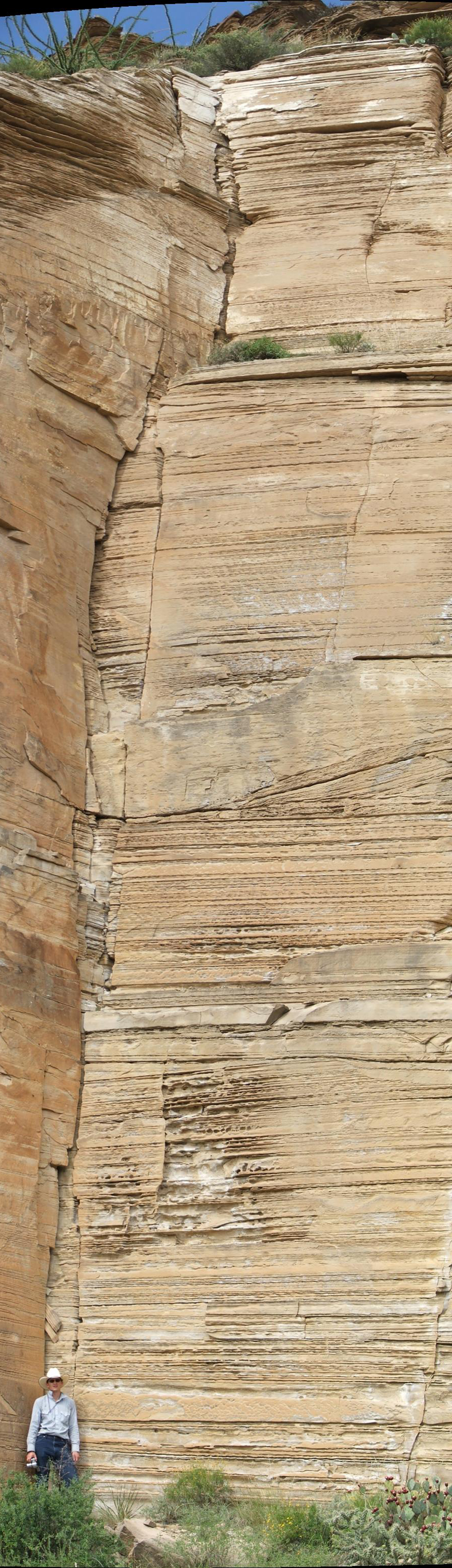 When you get up into Shumard Canyon you’ll be within an ancient submarine canyon succession (the siliciclastic and turbiditic Brushy Canyon Formation overlying the carbonate Cutoff and Victorio Peak formations). One particularly spectacular exposure of the Brushy Canyon is a vertical cliff of nearly 100% plane- and ripple-laminated fine sandstone.