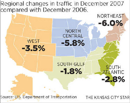 Call me a cynic, but real changes in our energy situation will only come when people start feeling it economically. I think things are starting to happen – GM has seen a 27% drop and Ford a 36% drop in SUV sales and a huge increase in sales of smaller/hybrid cars since last year (I don’t have a link for those numbers, the TV people said it as I write this). The map below (from this article) also shows a nationwide decrease in driving. Did people decide that taking the bus or carpooling was the “right” thing to do? Maybe some of them did, but I would guess that most are trying to save money.