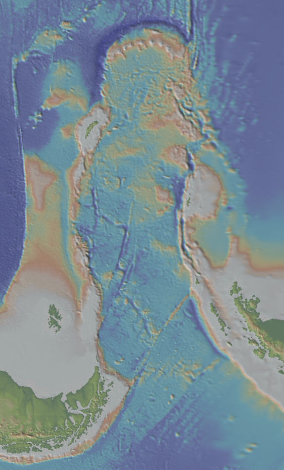 As you might tell by looking at the bathymetry, this is a pretty complicated area tectonically. There’s subduction occurring at the top of the image and east-west oriented strike-slip movement along the prominent submarine ridges (some of which pop out as islands). The Sandwich Plate is separated from the Scotia Plate by an area of sea-floor spreading that is not immediately apparent on the bathymetry.