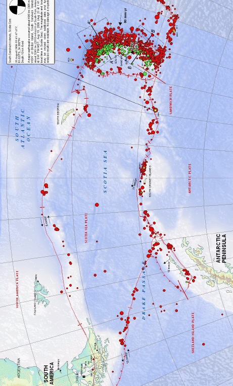 The map below shows the seismicity of the same area (from this USGS site) and is useful to compare with the bathymetry. Note the tiny Sandwich Plate behind the seismically active subduction zone at the top of the image.