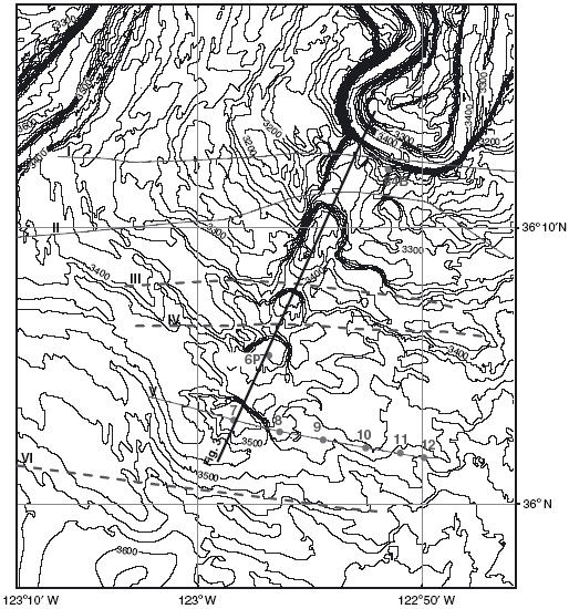 What the heck is a “cyclic step”? We’ll get to that later … first, I want to show a regional map to give you some context. The area we’ll look at in more detail is called the Shepard Meander, a huge meander bend in the Monterey submarine channel. In the map below, it is just barely on the image in the lower left (annotation mine). The Monterey submarine canyon, which is offshore of the central Californian coast, transitions from a canyon cut into the bedrock of the continental shelf to a submarine channel system off in deeper water that has both erosional and depositional features associated with it.