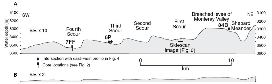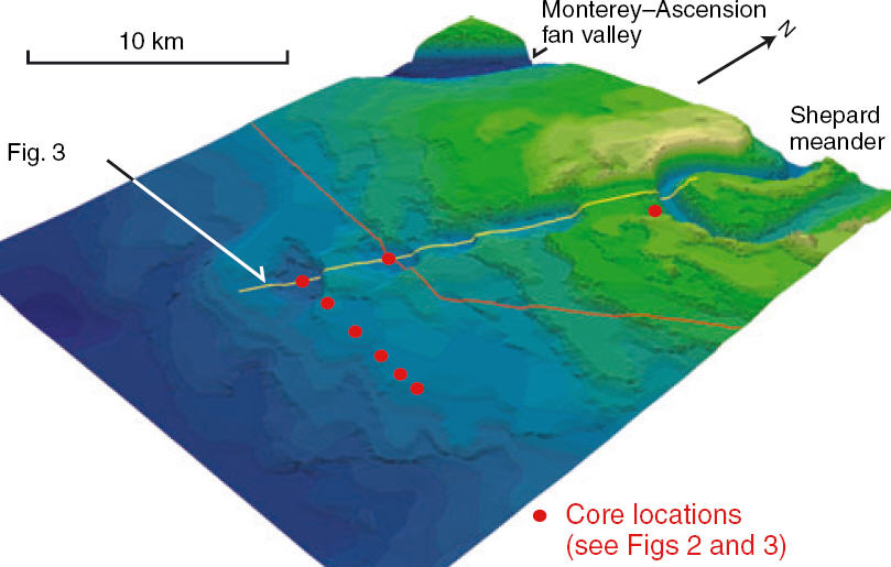 Fildani, A., Normark, W.R., Kostic, S., and Parker, G., 2006, Channel formation by flow stripping: large-scale scour features along the Monterey East Channel and their relation to sediment waves: Sedimentology. doi: 10.1111/j.1365-3091.2006.00812.x