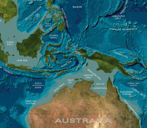 What I like about this map is that the land parts of the map are from satellite imagery … makes a nice combination with the blue-themed bathymetry.
