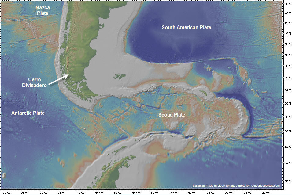Before that though, I wanted to describe the general setting and show some photographs of my field area. The paper is about a detailed outcrop study of deep-marine stratigraphy at a mountain called Cerro Divisadero in southern Chile.