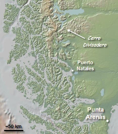 The next map below zooms in showing a perspective view to the north (from GoogleEarth) with Puerto Natales near the bottom of the image. Cerro Divisadero is in the distance to the north. Note the east-dipping strata on the right side of the image. That is part of this Upper Cretaceous outcrop belt that trends north-south (parallel to the Andean orogen).