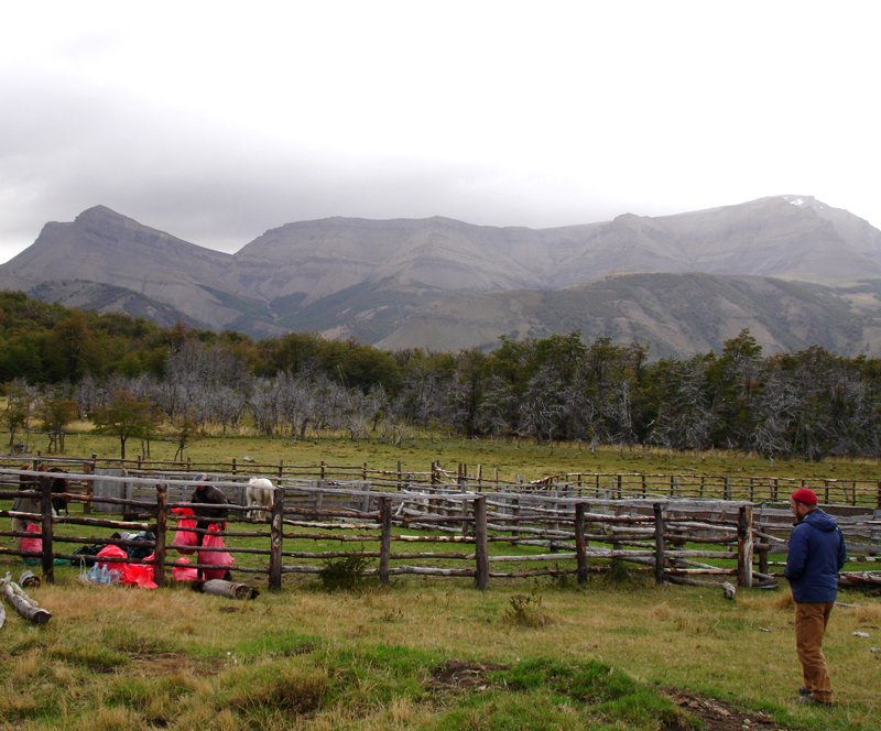 In the photo above that’s me looking on as the two gauchos we hired to take us to this site pack our gear into bags. These guys are experts at perfectly balancing out the load on the pack horses … we just needed to stay out of their way. Note the craptacular weather … not windy (for once), but drizzly and probably about 45 degrees Farenheit.