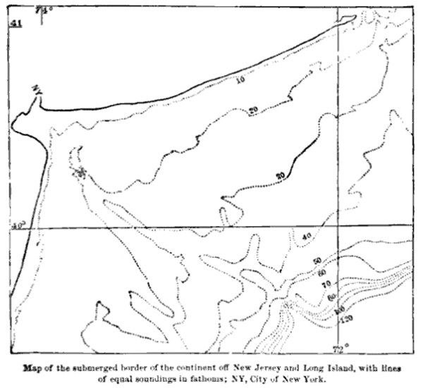New York City is denoted by the ‘NY’ in the upper left. The contours are in fathoms (1 m = 0.55 fathoms) and nicely shows the Hudson Shelf Valley, which is the course of the Hudson River when sea levels were 130 m lower during the Last Glacial Maximum (~20,000 yrs ago).