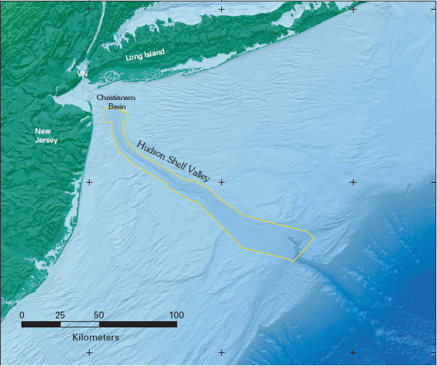 New York City is denoted by the ‘NY’ in the upper left. The contours are in fathoms (1 m = 0.55 fathoms) and nicely shows the Hudson Shelf Valley, which is the course of the Hudson River when sea levels were 130 m lower during the Last Glacial Maximum (~20,000 yrs ago).