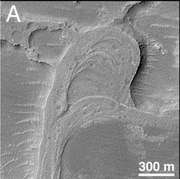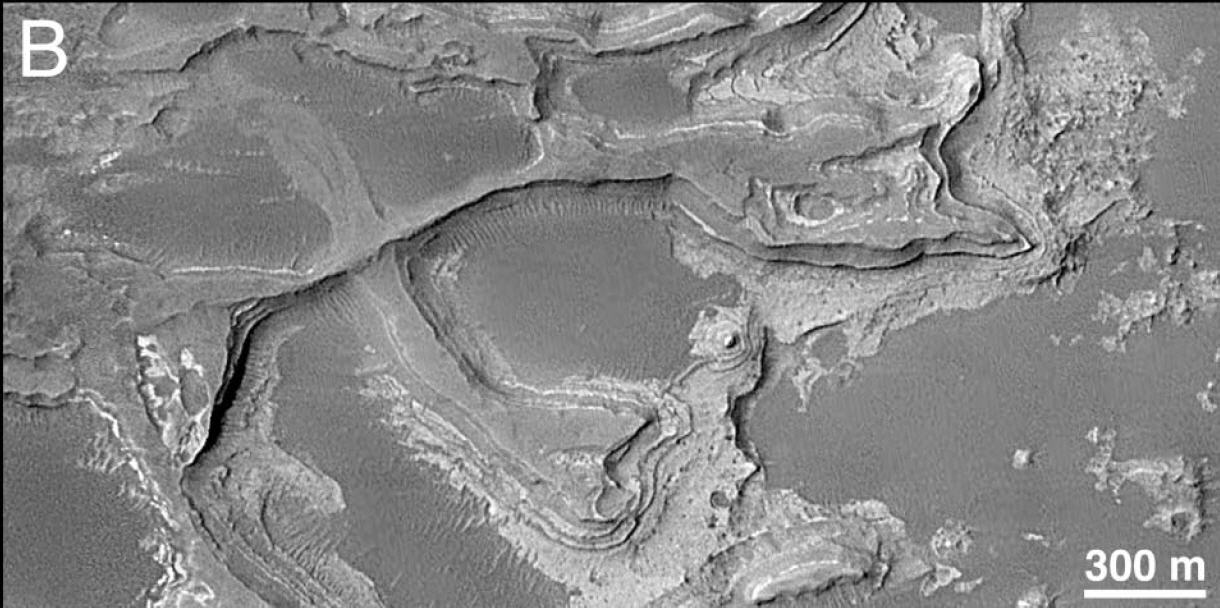 Compare to this nice image of Mississippi River meander loops here on Earth. While these are certainly different scales, the form and patterns are very similar. If you looked around on GoogleEarth, I’m sure you could find a nearly identical analog (if you do, let me know in the comments).