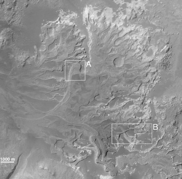 These particular images are from what are interpreted to be ancient river and delta deposits exposed on the surface of Mars. This area is known as the Eberswalde Delta (contained within the crater of the same name).
