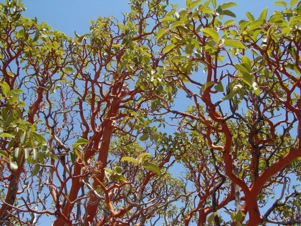 The brilliant orange-red bark of the madrone stands out amongst the relatively drab sandstone cliffs and other green plants.