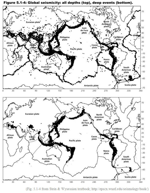 Fig. 10: Global seismicity (a) all events, (b) deep events (credit: Stein & Wysession; http://epscx.wustl.edu/seismology/book/)