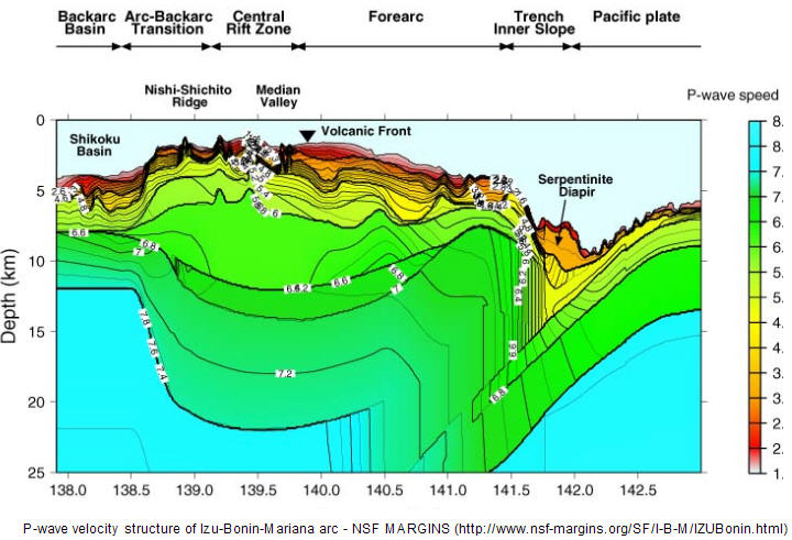 The image below is the P-wave velocity structure of a transect of the Izu-Bonin-Mariana (or IBM) arc system. This image and much more can be found on the NSF-MARGINS ‘Subduction Factory’ initiative’s webpage for the IBM system.