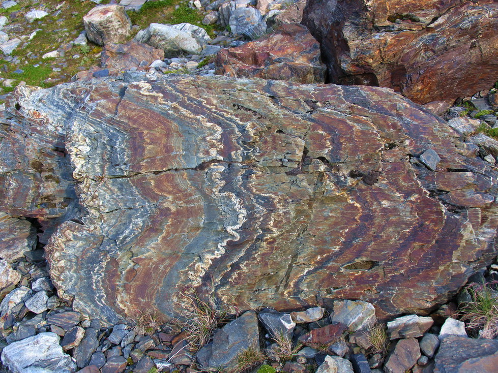 My first guess guess, looking at this in reader, was that it looked like the fine intraformational folding you can get when anhydrite rehydrates in situ to gypsum… but the color, texture and luster don’t look right. Then I was thinking a metamorphosed and ptygmatically folded BIF… but I don’t know that I’ve ever seen bright white layers of quartz like that. Quartz veins, yes, but not interbeds. Then I noticed the location… I’ve been to Ushuaia, and from what I recall, most everything I saw there was schisty in nature, with some dikes. There does seem to be sort of a rhythmic nature to the bedding, so my money is on Silver Fox’s answer. Though as she points out, those are some mighty unusual colors for turbidites, metamorphosed or not.
