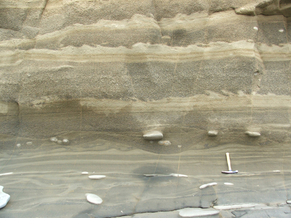 The bottom part, from base of visible section to just above the top of the hammer handle, is alternating siltstone and fine-grained sandstone — most of it plane-laminated with some ripple-laminated beds. Above the hammer is alternating granule-pebble conglomerate beds (brown) and fine- to medium-grained sandstone (beige). The conglomerate beds are normally graded with some faint horizontal stratification. The sandstone beds are also normally graded with plane-lamination near base.