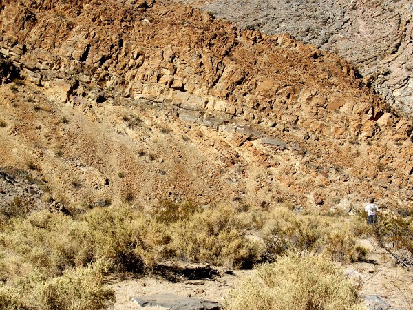 The layers below the unconformity are the lower Permian Darwin Canyon formation seen at the folds up-canyon. The layers on top are Triassic marine deposits (and may correlate to similar age strata in Butte Valley). The angular discordance of the unconformity is about 20o. The age of this unconformity has been quite well dated. The youngest fossils in the beds from under the unconformity are Wolfcampian fusilinids of the Panamint Springs member of the Darwin Canyon formation. The oldest fossils from the layers above the unconformity are Guadelupian (Capitanian) brachiopods and mollusks.