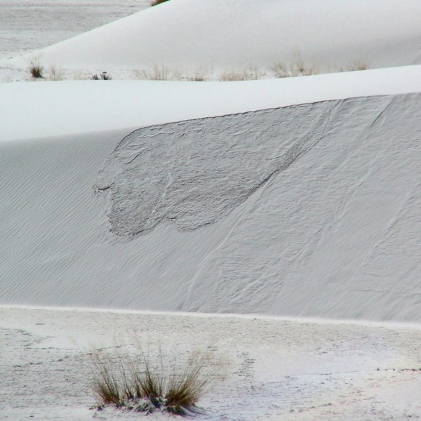 As sand grains (in this case, the grains are made of gypsum) saltate along the dune surface by wind they reach the crest and begin to pile up in the ‘shadow’ of the wind. Then, every once in a while, a threshold is reached and a small flow of grains — a little sand avalanche, if you like — occurs moving a mass of grains down the slip face. This happens repeatedly and in different spots along the dune resulting in migration of the dune over time. This avalanching of sand grains is preserved as cross-stratification in the dune* and, if the geologic consequences are right, that dune will be preserved and lithified in the record as beautiful cross-bedded sandstone.