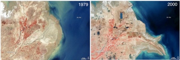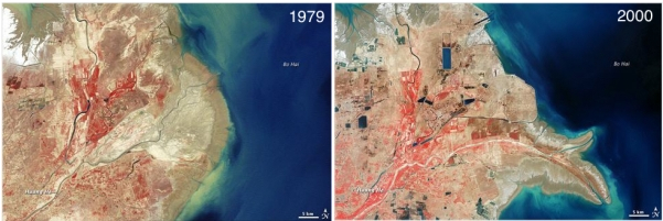 Great post, Brian, but I want to quibble just a bit with your choice of words in one part. You refer to “pre- and post-human influence” to contrast the 1979 and 2000 images, and there is clearly a human influence at work here. The thing is, particularly in China, the human influence on the Huang He (and presumably its delta) goes back far beyond 1979 (for some brief history see the Wikipedia entry.