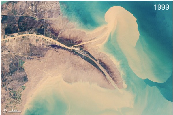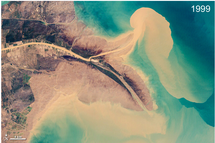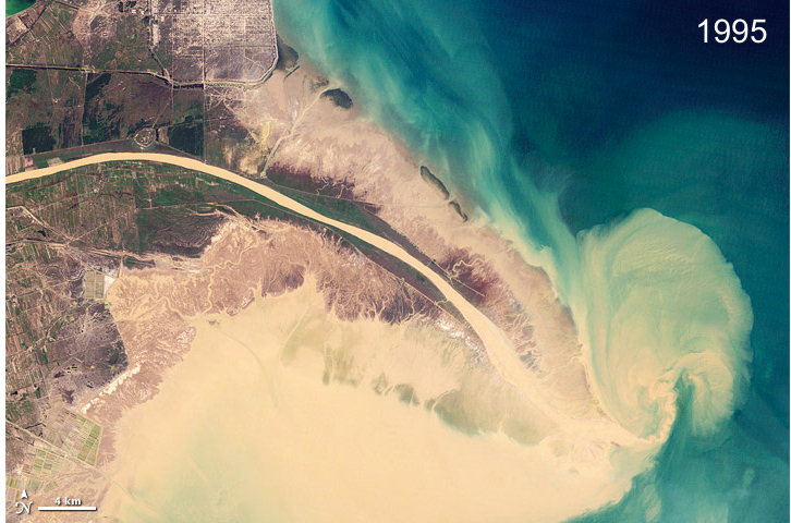 Between 1989 and 1995, the delta became longer and narrower along a southeast-bending arc. In 1996, however, Chinese engineers blocked the main channel and forced the river to veer northeast. By 1999, erosion and settling along the old channel caused the tip of the delta to retreat, while a new peninsula had formed to the north.
