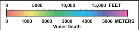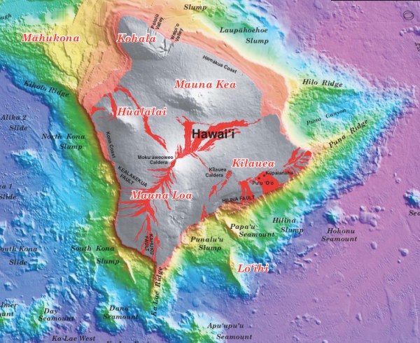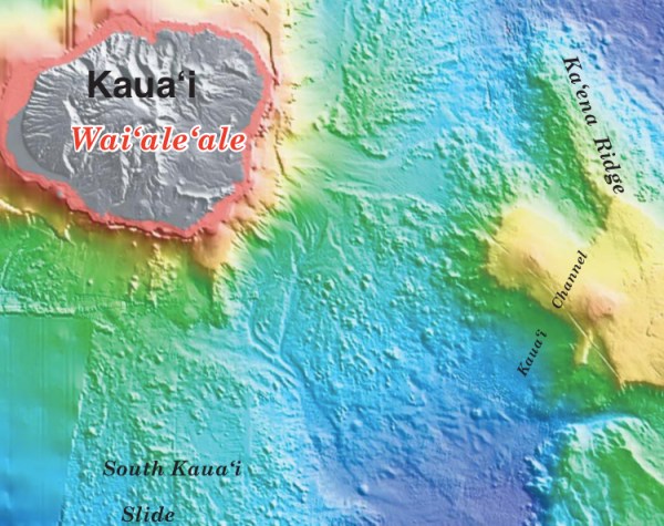 This is some serious relief — nearly 10,000 m (32,000 ft) from the highest peak on the Big Island to the deep sea floor off to the southeast. As a result of that relief, immense submarine landslide/slump deposits make up much of the flanks of these islands.