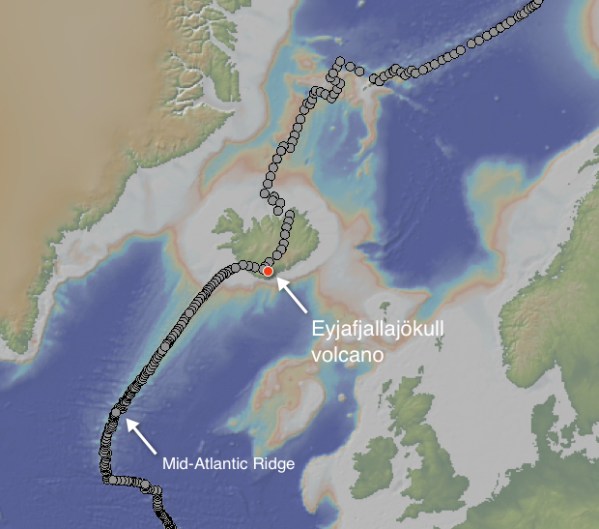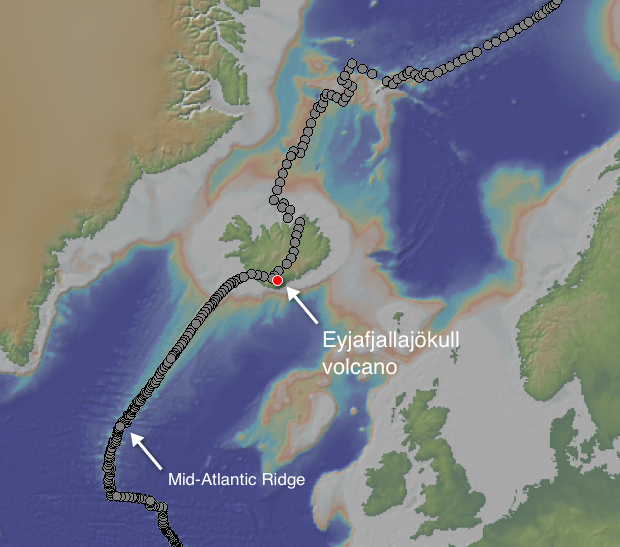 The next one is from GeoMapApp and simply shows the position of the Mid-Atlantic Ridge, Iceland, and Eyjafjallajokull.