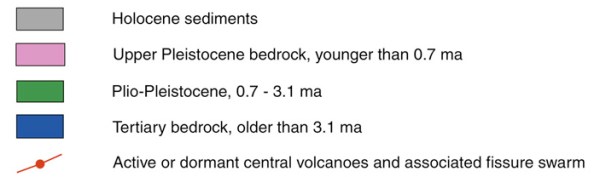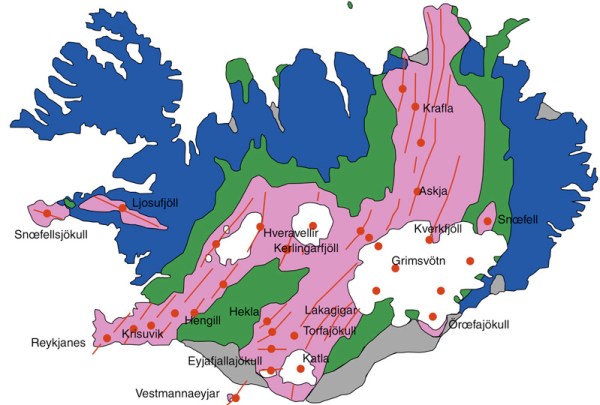 While searching for images I came across a great site from Tobias Weisenberger that, among many other topics, included a page on the geology of Iceland. If you want to learn more about the origin and evolution of this area I recommend it. The image below shows the bathymetry in relation to the age of the Iceland plume (yellow dots in millions of years) and the active rift zones (red lines).