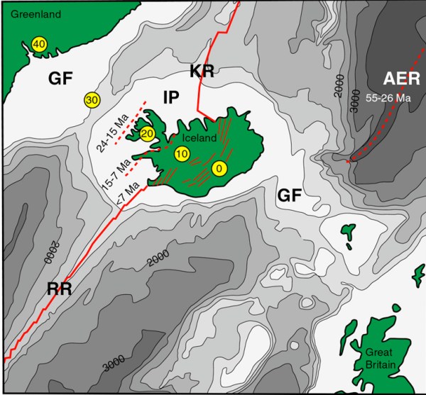 The first image (below) is a regional map centered on Iceland. I found it on this article on the mantleplumes.org site.