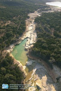 In 2002, flood waters from Canyon Lake dam reservoir in central Texas were diverted into an emergency spillway at nearly 200 times the normal flow rate. The resulting flood event, which lasted for six weeks, removed trees and sediment and excavated a 7 m deep and >1 km long canyon into the limestone bedrock.