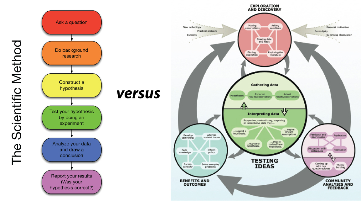 The key difference, of course, is the iterative nature of the diagram at the right. Anyone who has been involved in doing science knows that it almost never happens in the straightforward linear way depicted in the classic diagram. A researcher (or team of researchers) will constantly circle back to the motivating questions as they acquire information from the literature, conduct experiments/collect field data, and think about how their results fit into the bigger picture.