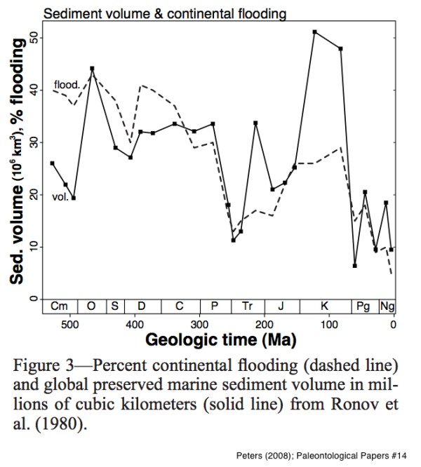 Why are there so many studies on outcrops of Cretaceous rocks in the stratigraphic literature? Why do sedimentary geologists focus so much on rocks from this time period? The simplest answer is because there is a lot of preserved sedimentary material from the Cretaceous. The diagram below, from Peters (2008) [PDF], reproduced from Ronov and others (1982), shows the global volume of preserved marine sediments (the solid line) through time. As you can see, the Cretaceous, denoted by the ‘K’ along the horizontal axis, is the big winner.