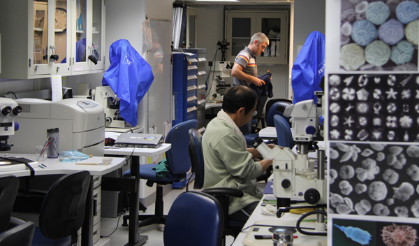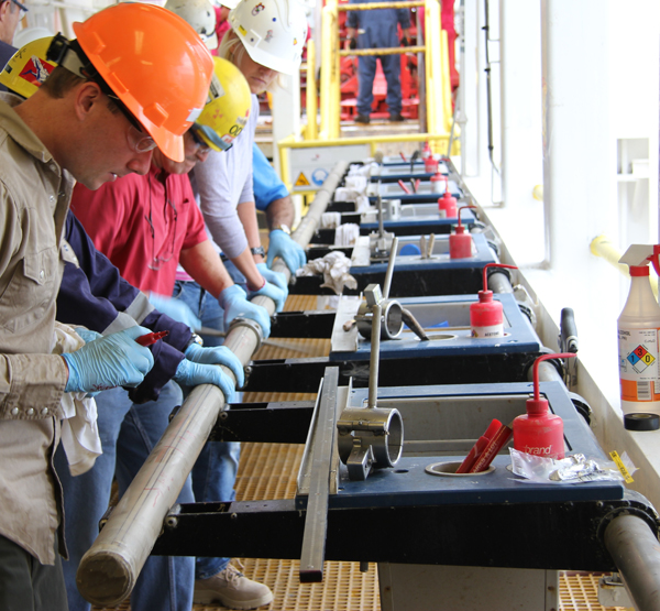 The science party starts analyzing the cores the instant they are transferred from the drilling floor to the catwalk. Samples are immediately taken from the core catcher, the very bottom of the ~9.5 m (~30 ft) long core, by the paleontologists who begin the work of figuring out where the core is in geologic time. Not all sediments contain the microscopic fossils that are useful for age determination, but they are all checked.