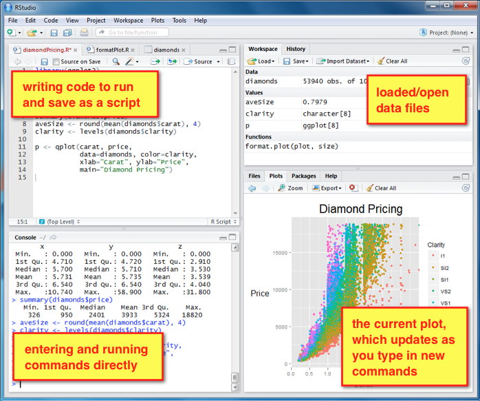I’ve recently started playing around with the free statistical/graphical programming language and software R. (Here’s some good intro documentation.) For a sampling of what the graphics look like, check out this image gallery. I use R through the separate RStudio interface, which I like quite a bit. This image is from the RStudio website with my own text annotation explaining what the four panels are for.