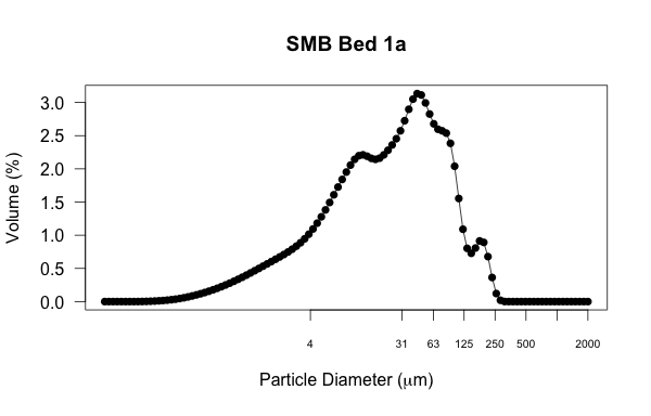 plot(smb_bed1a,type="o", las=1, pch=16, cex=0.65, log="x",xaxt='n',xlab=expression(paste("Particle Diameter (", mu,"m)")), ylab='Volume (%)',main="SMB Bed 1a")