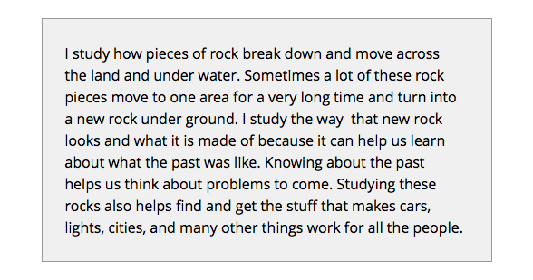 This was a great exercise for me and the restrictions made me really focus on my message. It was also helpful because as a geology undergrad I am often explaining what exactly it is I do, and plan to do in the future, to people who usually have no clue what I am talking about. It’s nice to keep things simple sometimes!