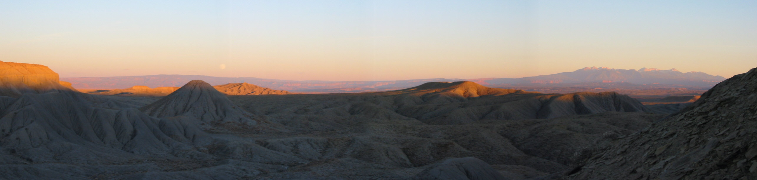 The images today are photomosaics taken from the same spot (roughly) — in an area called Bootlegger Wash (east of the town of Green River). In 2002 I went out with the rest of my research group for eight or nine days to help collect some data for two students who were doing projects here. Both photos are old-school, low-res (pre-GigaPan) mosaics.